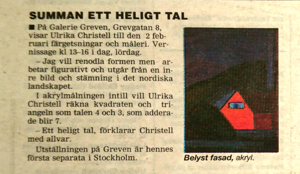 Min första separatutställning hade jag på Galleri Greven i Stockholm där jag visade färgetsningar och målningar.