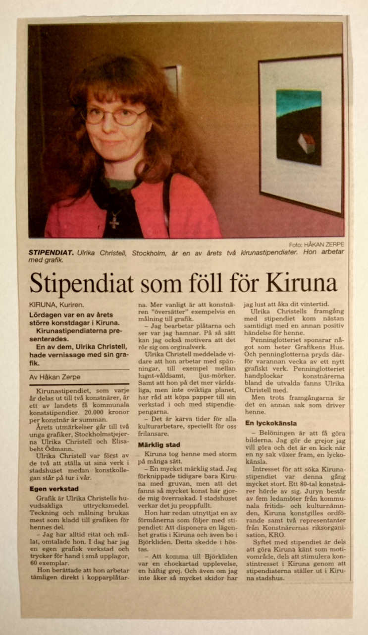 "Kiruna kommuns Kulturstipendium Kirunastipendiet delades år 1996 ut till två konstnärer, Ulrika Christell och Elisabeth Ödmann, som vardera fick 20 000 kronor och en månads fri vistelse i konstnärslägenheten i Kiruna stad och LKAB:s fjällstugor i Björkliden. Dessutom garanterade kommunen och LKAB inköp vid den utställning som Kiruna Konstgille ordnade. Syftet med stipendiet är dels att göra Kiruna känt bland konstnärerna som ett värdefullt och intressant motivområde, dels att stimulera konstintresset i Kiruna samt att ge kirunaborna möjlighet att bekanta sig med högklassig aktuell svensk bildkonst."